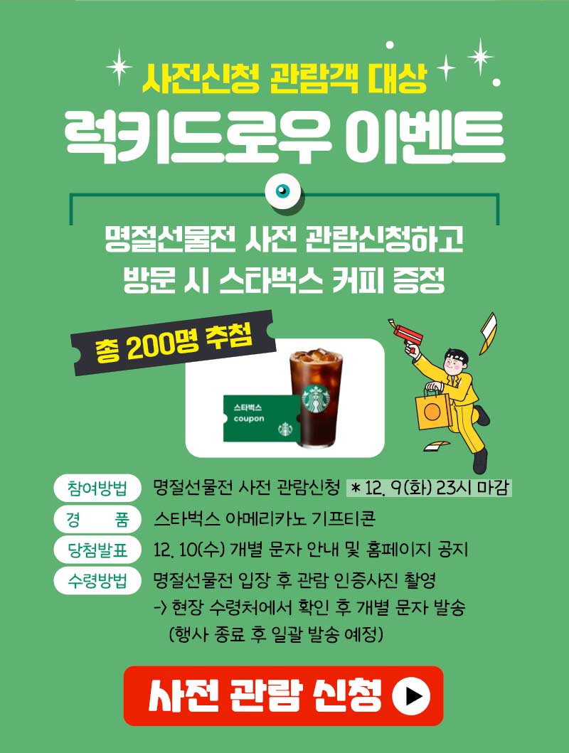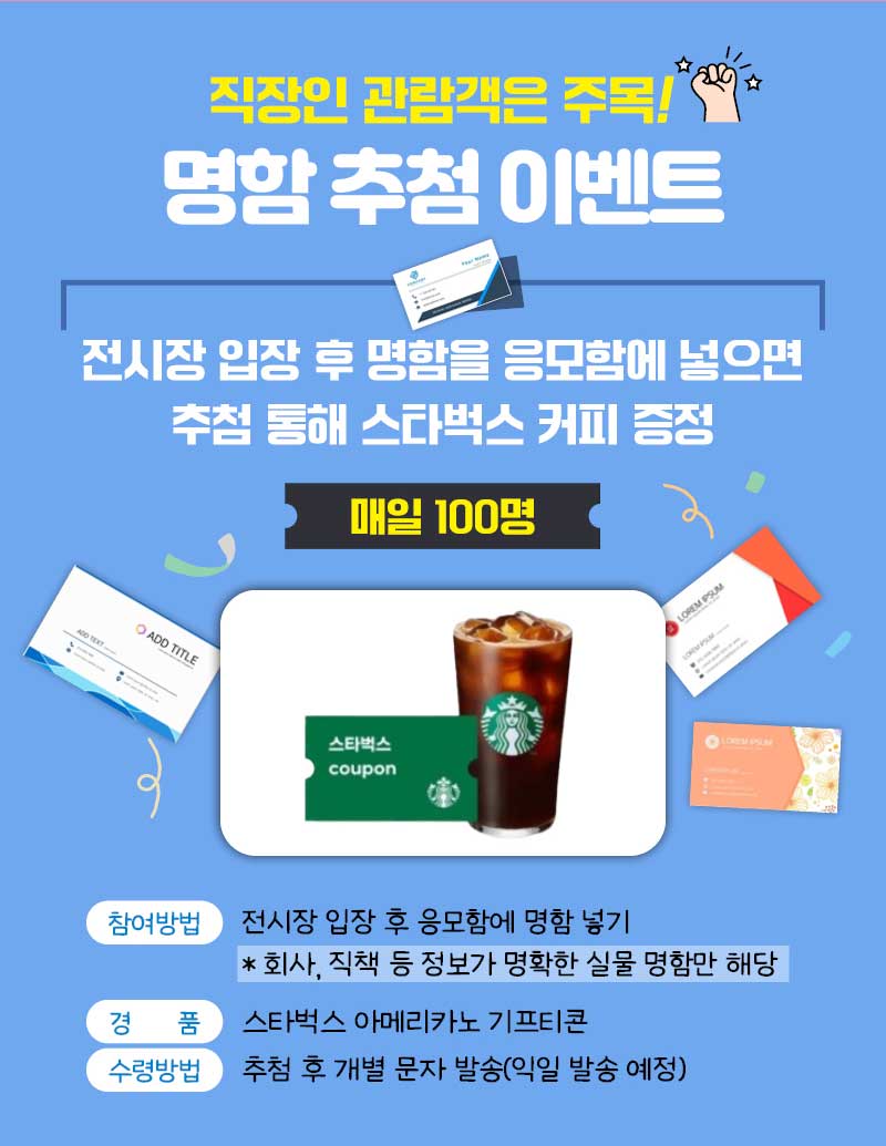 · 참여 : 전시장 입장 후 응모함에 명함 넣으면 매일 100명 추첨 · 상품 : 스타벅스 아메리카노 기프티콘 · 참여 : 명절선물전 전시장 입장 후 응모함에 명함 넣기 ※ 회사, 직책 등 정보가 명확한 실물 명함만 가능 · 수령 : 매일 100명 추첨 → 개별문자 발송(추첨 익일발송)